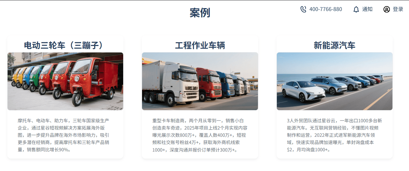 现状:企业已启动海外短视频与社交主页运营,依托星谷云平台开展数字化营销,处于“新渠道搭建+初期获客”阶段。