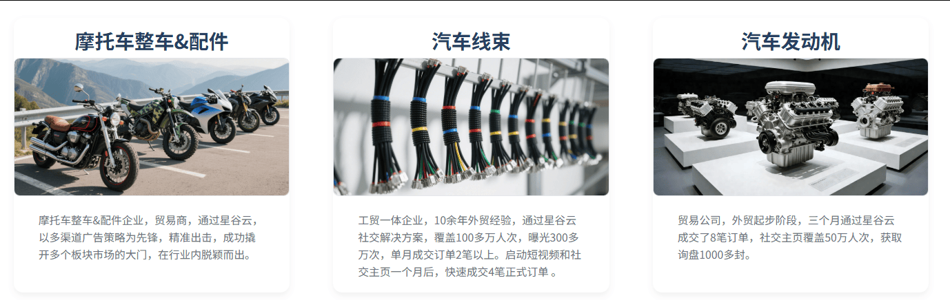 背景:企业为工贸一体的汽车线年以上外贸经验,当前阶段聚焦拓展海外市场,需通过短视频与社交主页提升品牌曝光与自主获客能力,从传统外贸模式向“品牌+精准获客”转型。