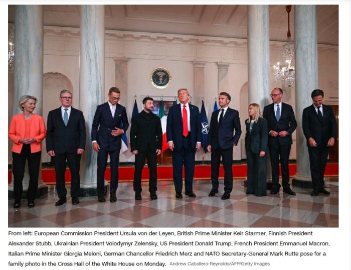 随后,特朗普和泽连斯基一同会见了英国首相斯塔默、法国总统马克龙、德国总理默茨、意大利总理梅洛尼和芬兰总统斯图布、欧盟委员会主席冯德莱恩和北约秘书长吕特等。