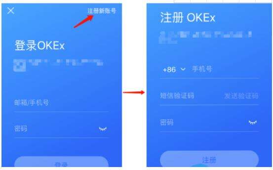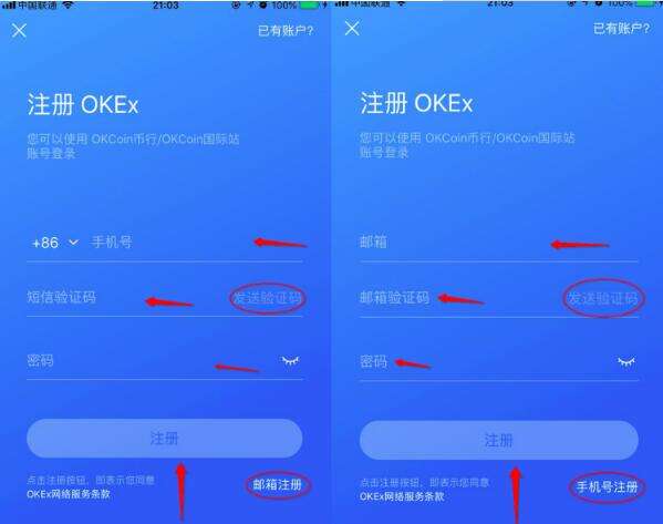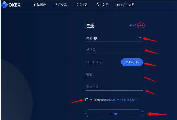 2、跳转注册页面,OKEx支持手机号注册和邮箱注册两种方式,按照要求填写信息;