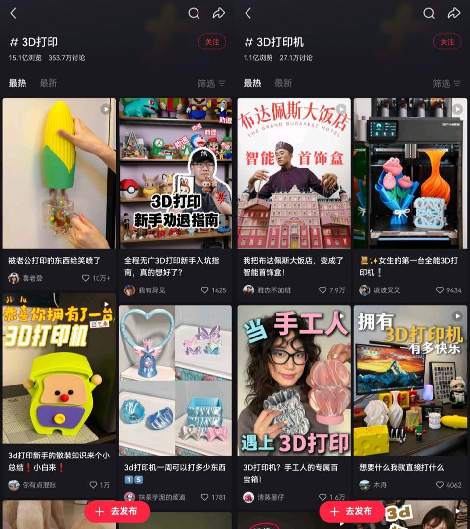 这种消费者需求和场景的裂变,让3D打印从小众爱好变成了大众工具。小红书上,以“3D打印”、“3D打印机”为关键词检索,线万篇笔记。有人分享开箱测评,有人交流建模技巧,形成了自发式的传播与种草。