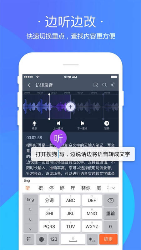 技术优势:主打“语音实时记录+自然断句”功能,支持语音指令(如“换行”“删除”)编辑文本,无需手动操作;移动端APP与网页端数据同步,适合会议、采访等实时记录场景;支持16种语言转写,普通线%,文本自动保存功能避免内容丢失。