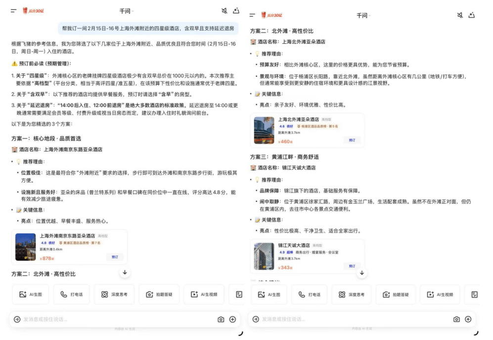 当用户对着千问App说 “订一间2月15日-16日上海外滩附近的四星级酒店,含双早且支持延迟退房”,千问即刻依托飞猪的供应链资源,推荐出多款优质酒店产品,点击卡片即可进入确认及支付环节。