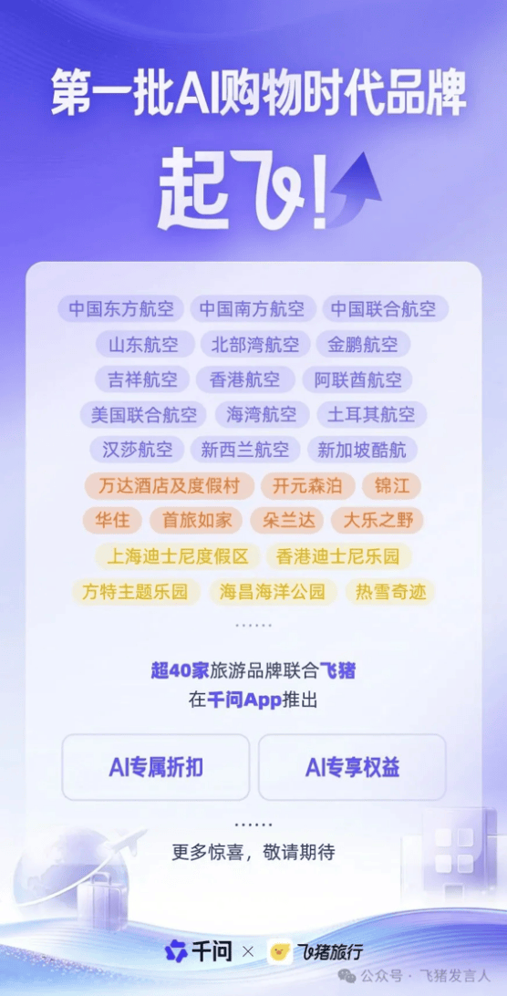 行业看到了 AI 重构旅游消费的线日,千问和飞猪相继宣布,已有超40家旅行品牌与之展开AI合作,东航、南航、中联航、万达酒店及度假村、开元森泊、锦江、华住、首旅如家、上海迪士尼、香港迪士尼等头部航司、酒店及主题乐园悉数在列,在千问App订旅游的“AI用户”,这些商家给专属补贴价格和增值权益。