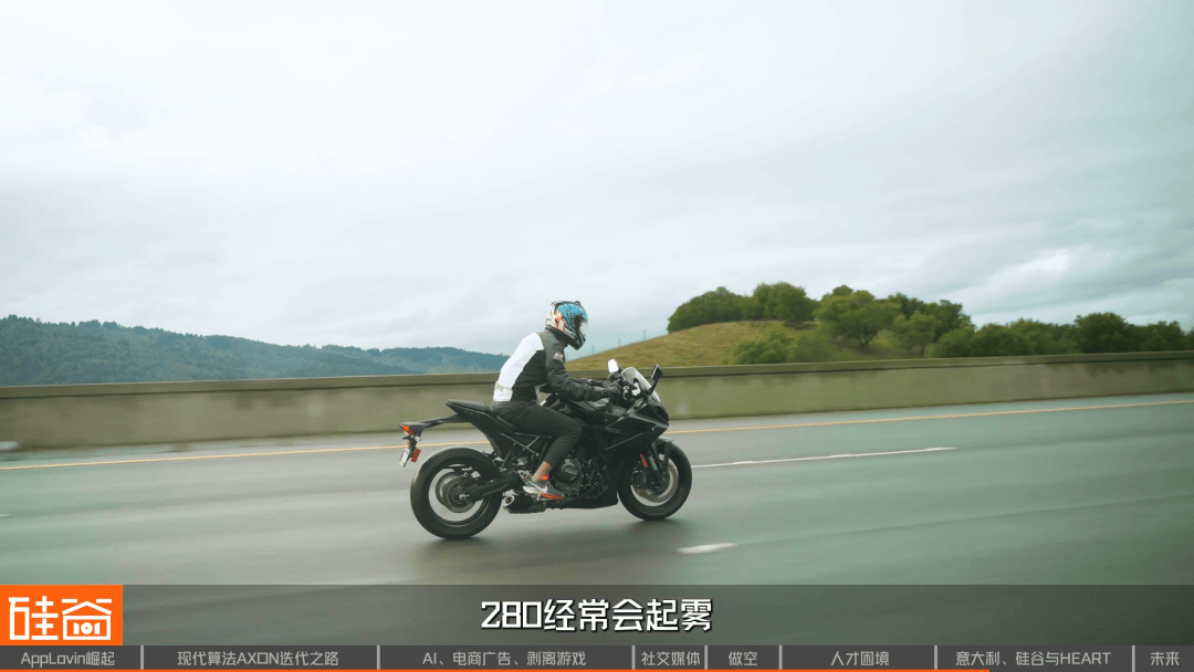 一般骑个70 迈(英里/小时)左右,我觉得是很舒服的一个感觉,风会从你两边拂过,你能从头盔里感觉到风的声音,而且280公路两边是山,经常会起雾,雾在山间飘过,骑摩托车视野比较好,左边右边的景色都能感觉到,非常非常舒服。