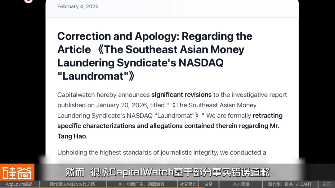第三战就是最近的CapitalWatch,对Applovin参与“东南亚洗钱”与地缘政治的指控。然而很快CapitalWatch基于部分事实错误道歉并撤回了部分的指控,但表示仍然会对AppLovin提出进一步质疑。